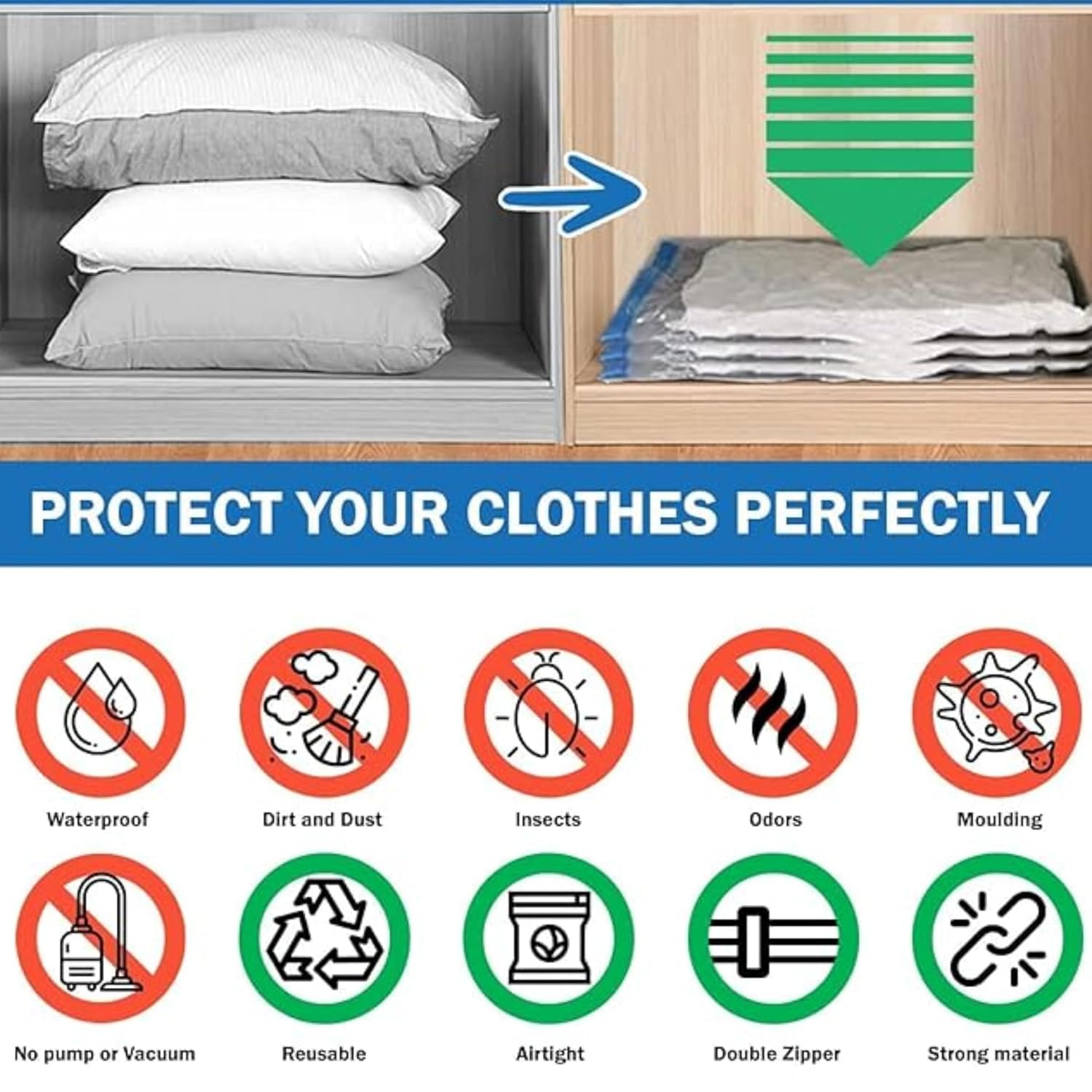 Pacquita space saver vacuum bags reduce storage volume by up to 80%, keeping your clothes, bedding, and seasonal items neatly compressed and protected. Featuring a reinforced double zipper and triple-seal valve, these moisture-proof, odor-resistant compression bags prevent dust, mold, and pests. Ideal for closet organization, travel packing, and moving storage, these bags maximize space and keep your items fresh and secure.