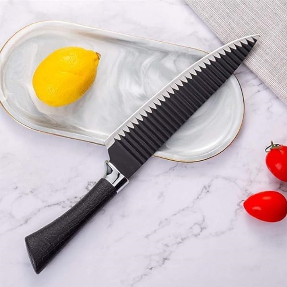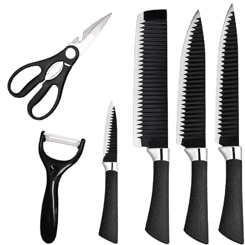 6 Pcs Kitchen Knife Set featuring high carbon stainless steel blades with black coating—a complete collection designed to meet all your cutting, slicing, and chopping needs. This set combines durability, sharpness, and sleek aesthetics to provide you with professional-grade knives for everyday cooking. Versatile Collection for Every Kitchen Task The set includes six essential knives: a chef knife ideal for chopping vegetables and meats, a santoku knife designed for precise slicing and dicing, a bread knife with serrated edges perfect for slicing crusty bread, and three utility knives for various cutting needs. This diverse range allows you to handle every kitchen task with ease and precision. Durable High Carbon Stainless Steel with Black Coating Crafted from high carbon stainless steel, the blades provide excellent edge retention and corrosion resistance. The added black coating not only protects against rust but also reduces glare and adds a modern, sophisticated look to your kitchen tools. These blades maintain sharpness for longer, reducing the need for frequent sharpening. Easy to Maintain To maintain the sharpness and the finish of the black coating, hand washing is recommended. Avoid abrasive cleaning methods or dishwashers that can damage the blades or handles. With proper care, this knife set will remain in excellent condition for years.