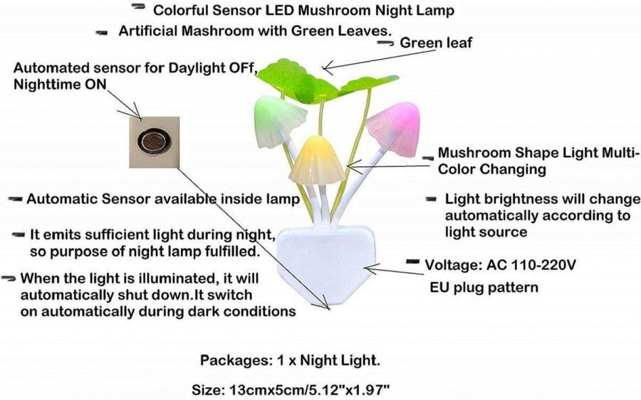 The mushroom shaped light illuminates in a variety of colors which set the right, soothing ambience. 1 LED change colors whereas 2 LED glows in static color.