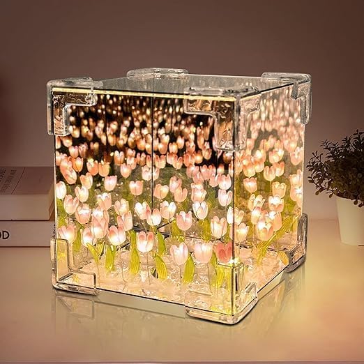 DIY Tulip Cube Mirror Lamp - 20 LED Flowers, Handmade Infinity Mirror Light, 2-in-1 Decorative Table Lamp & Mirror