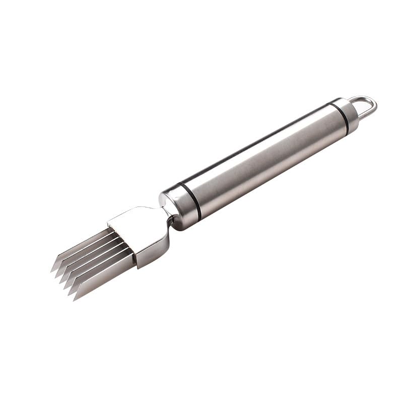 The PrimeChoice Stainless Steel Onion Cutter & Vegetable Slicer is a manual kitchen tool constructed with parallel blades designed to perform slicing and dicing actions through repeated pressing motions. Built from a single stainless steel body, the tool features evenly spaced vertical blades intended for use on small and medium-sized ingredients such as onions, chives, garlic, green chilies, and other soft vegetables. The handle is integrated into the blade structure to allow a firm grip during downward movement, and the overall size is suitable for handheld use without additional attachments. The two-way slicing function allows users to apply motion in either direction, depending on the cutting surface or preferred technique. It may be used directly over chopping boards, bowls, or flat surfaces during routine food preparation. The spacing between blades remains consistent, helping to produce uniform slices or cuts when used with steady pressure. Suitable for both quick ingredient prep and repetitive chopping tasks, the tool is compatible with a variety of herbs and aromatics typically found in everyday meals. Its compact and slim profile supports drawer storage or placement in utensil containers when not in use. Cleaning can be done under running water or using a soft brush to clear residue between the blades. The tool is intended for home kitchen use where basic dicing and slicing are required without the need for electrical appliances or large cutting boards.