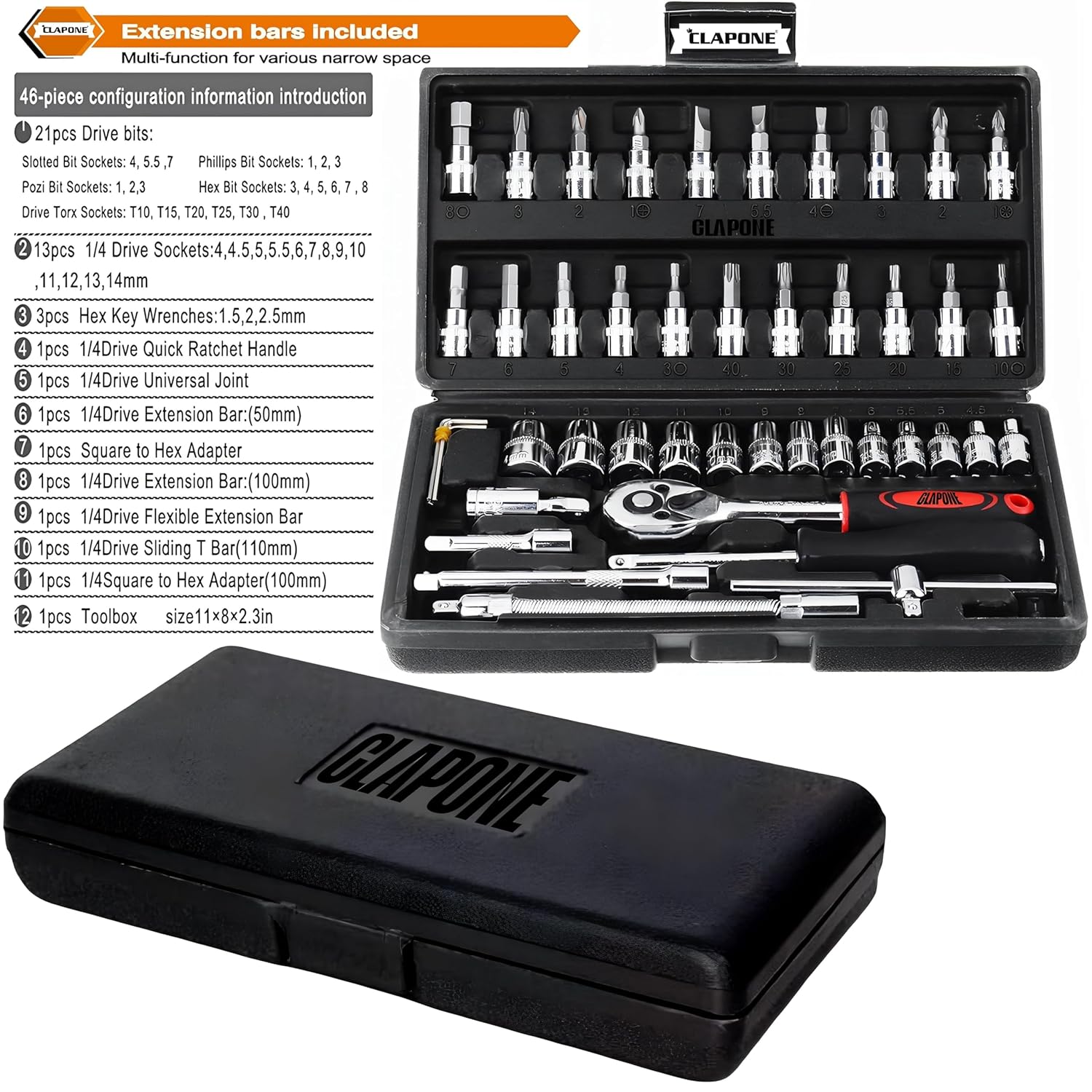 Tool Kit 46 Pcs Household | 1/4 Drive Socket Screwdriver Wrench Set for Bike, Car Repairs & More Spanner & Socket Set All Size Tool Kit Goti Pana Perfect for DIY Enthusiasts, Black